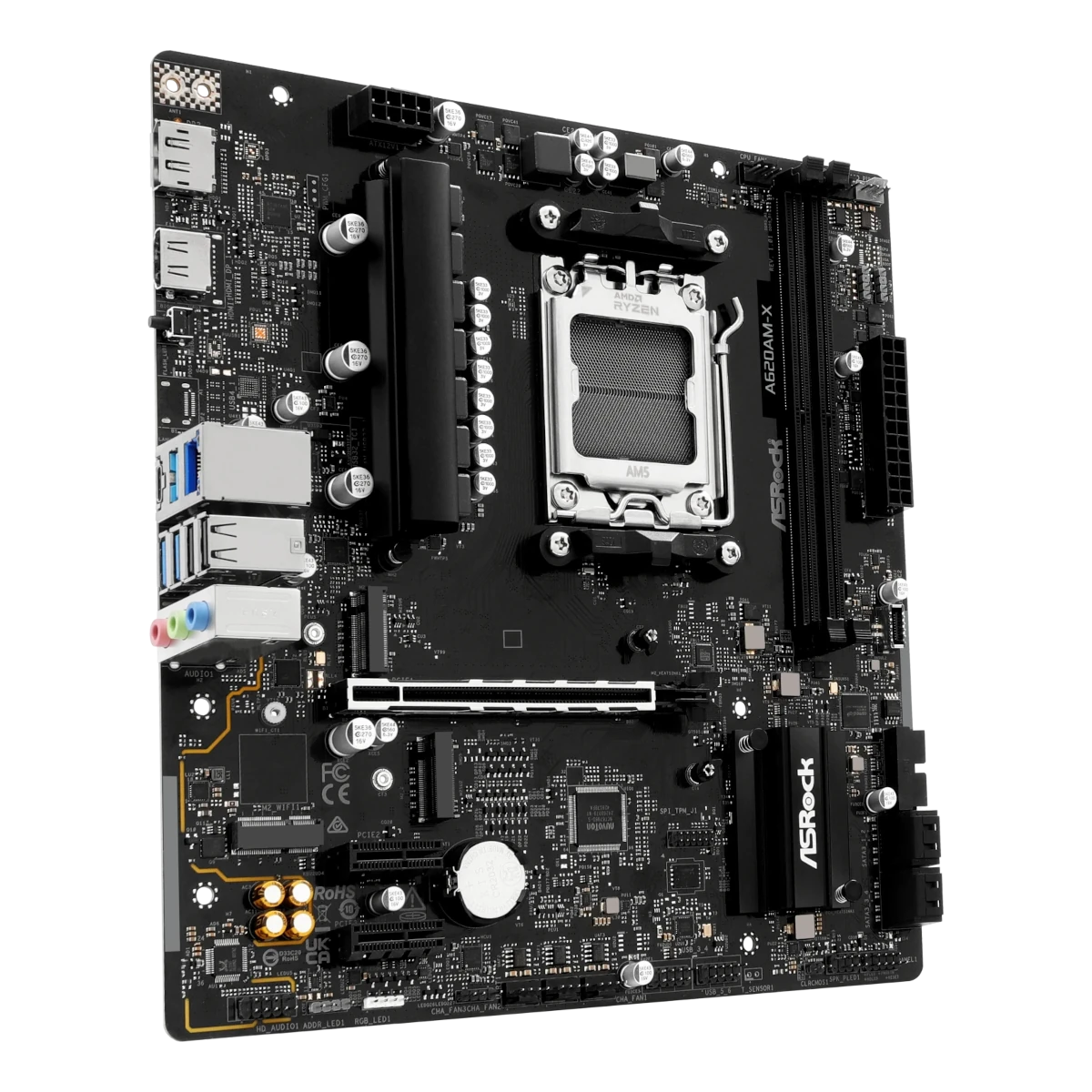 Chipsatz: AMD A620 / Prozessorsockel: Sockel AM5 / Speicherunterstützung: 2x DDR5 / Formfaktor: Micro-ATX
