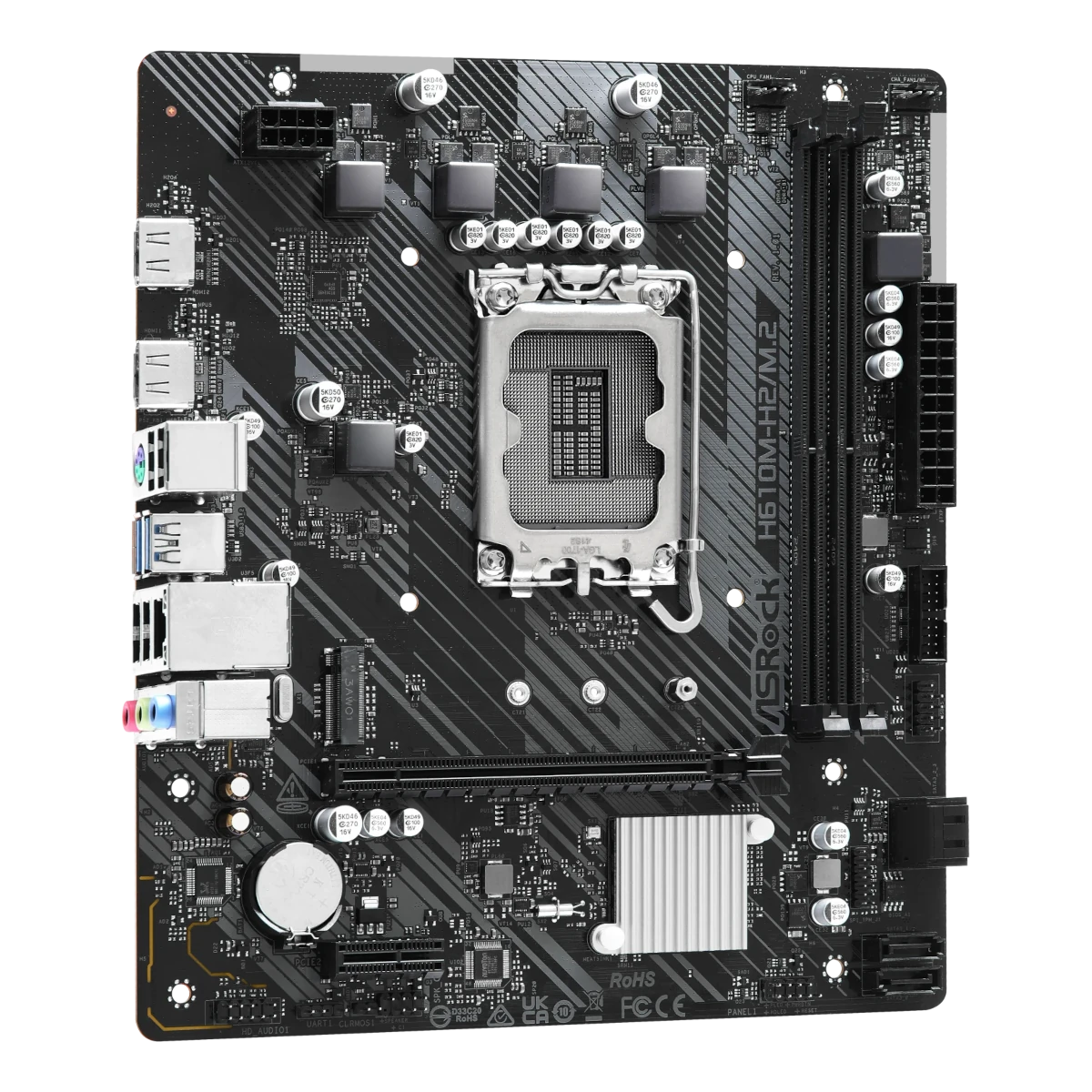 Chipsatz: Intel H610 / Prozessorsockel: Sockel 1700 / Speicherunterstützung: 2x DDR5 / Formfaktor: Micro-ATX