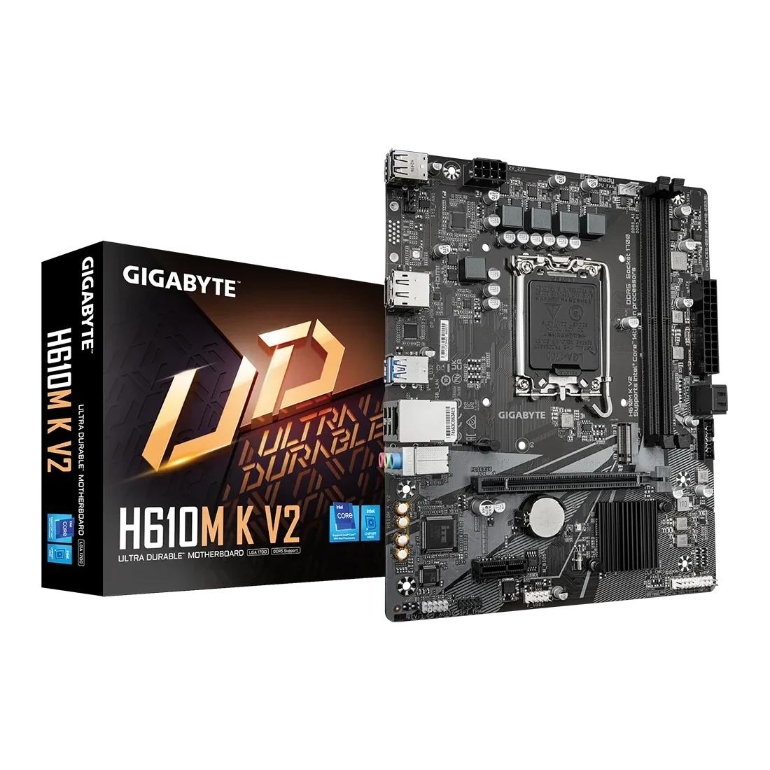 Chipset: Intel® H610 / Processor socket: Base 1700 / Memory support: 2x DDR5 / Form factor: Micro-ATX