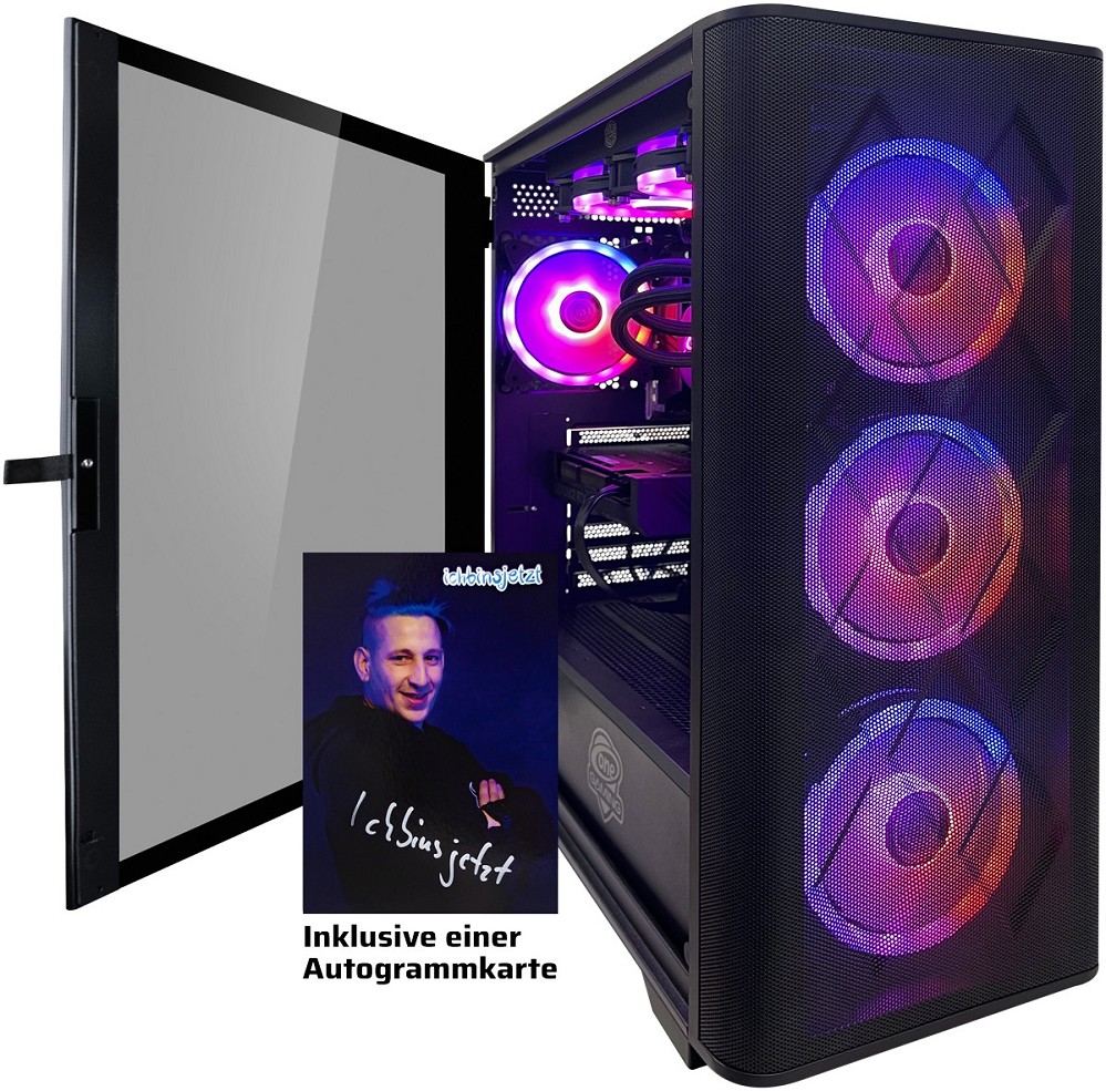 Prozessor: AMD Ryzen 5 5500 (6 Kerne, bis 4.2 GHz) Wasserkühlung: MSI MAG CORELIQUID A13 240 Grafikkarte: RTX 5060 Ti PNY (16 GB GDDR7) Arbeitsspeicher: 16 GB DDR4 3200 MHz ADATA SSD: 1 TB Crucial (PCIe 4.0) Mainboard: MSI B550-A PRO Betriebssystem: Windows 11 HomeONE Gaming PC AN113 – Ichbinsjetzt Edition
